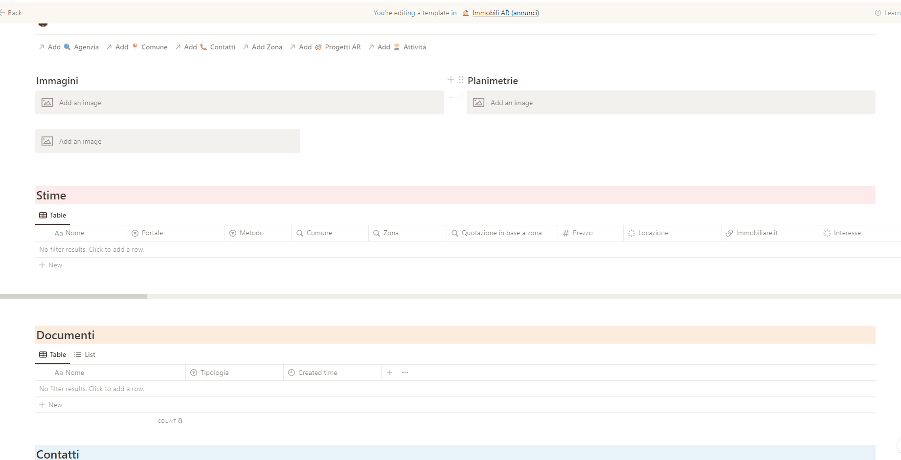 Il database degli immobili, ad esempio, presenta il template “Nuovo immobile” con all’interno i pulsanti per aggiungere agenzia, comune, contatti, le immagini eccetera. L’aspetto interessante è l’aver inserito delle viste filtrate su quello specifico immobile per tutti gli altri database che contengono informazioni sull’immobile stesso. Il filtro dinamico basato sulla relation del database immobili stesso, permette di filtrare solo le informazioni ad esso legate.