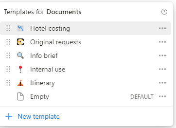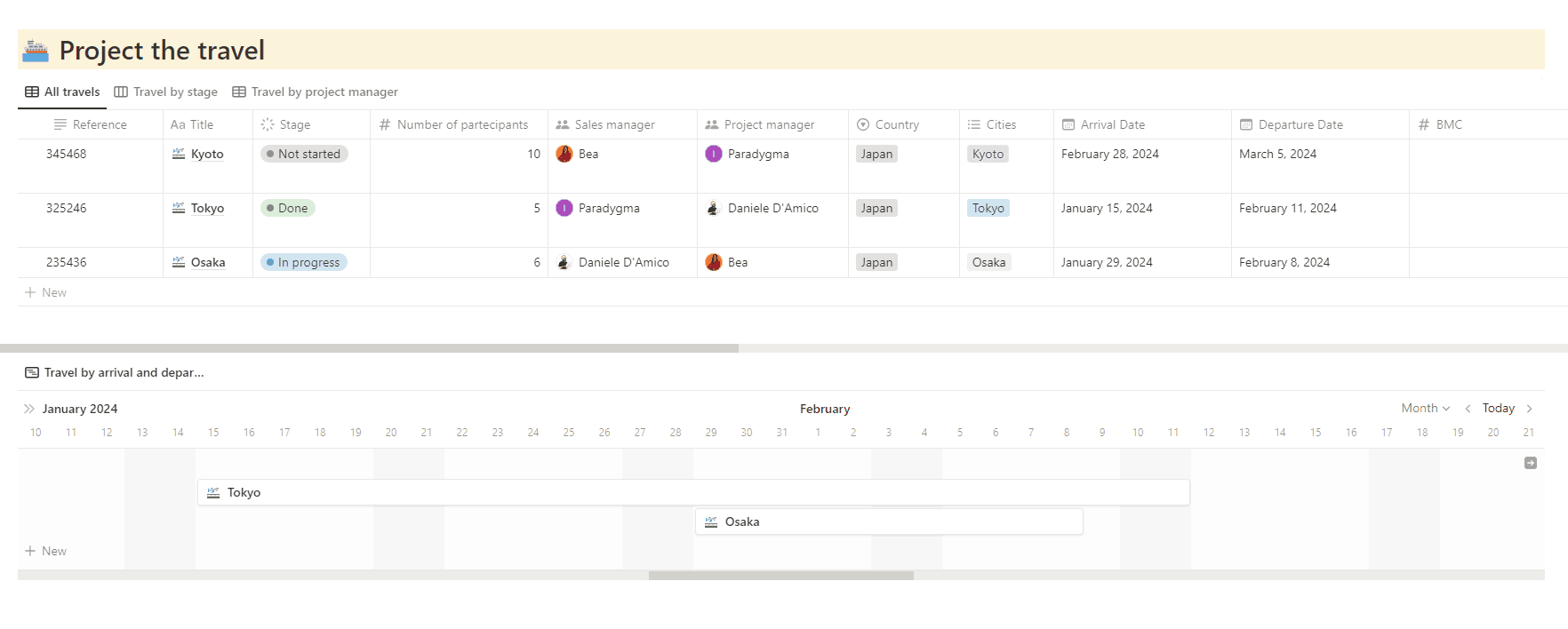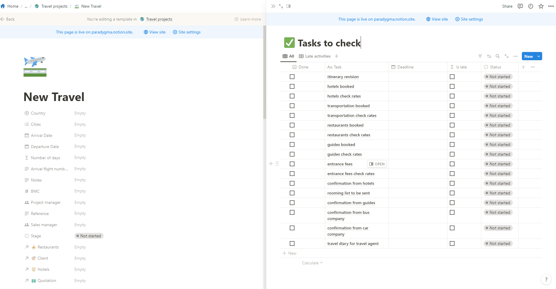 Per ogni database, inoltre, è stato creato un apposito template con all’interno le informazioni necessarie. Nell’esempio qui sotto del database “Travel projects” è possibile vedere tutte le proprietà del template e i database filtrati sul template stesso all’interno della pagina.