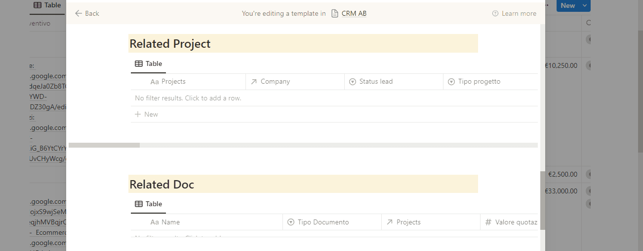 Per efficientare il lavoro, abbiamo creato un template “New Lead”, da attivare ogni volta che si deve inserire una nuova lead a CRM. All’interno si trovano delle visualizzazioni filtrate dei database Progetti e Documenti, creati insieme al CRM nel workspace di Becreatives. Questo ha permesso un controllo rapido e immediato di tutti quei progetti e documenti collegati al singolo cliente, per avere tutto in un unico posto.