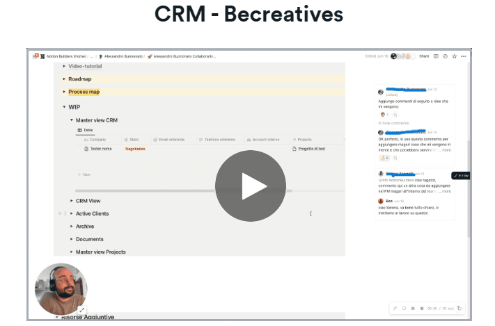 All’inizio di ogni nostra collaborazione, condividiamo con il cliente il Collaborative Workspace, ovvero una pagina Notion in cui il cliente può vedere, sin dal primo giorno, la costruzione in progress che può commentare man mano. Inoltre, al suo interno inseriamo tutti i materiali e i video tutorial rilasciati nel corso della collaborazione.